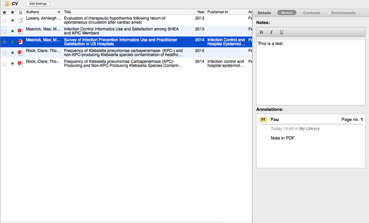 - PDF notes displayed alongside notes taken in Mendeley, but viewing annotations still requires opening the PDF.