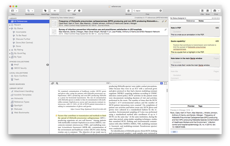 I really like Sente. It has my favorite sync system of any of the applications I tried2 and it is the only application I found that combines notes and PDF annotations in the main view. The UI is not as modern as Papers, but comparable in terms of usability. It has a steep learning curve for tagging and was difficult to set up with my library’s proxy server, but it has great documentation. If you can live without sync with Windows users, I think Sente is a great choice (appears to be abandoned – see update above).
